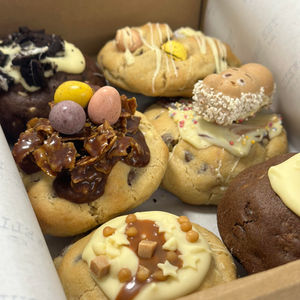 A selection box of 6 of our handmade stuffed cookies. Our cookies are soft and gooey, especially when heated in the microwave for 20 seconds, the stuffed centre melts in the middle.